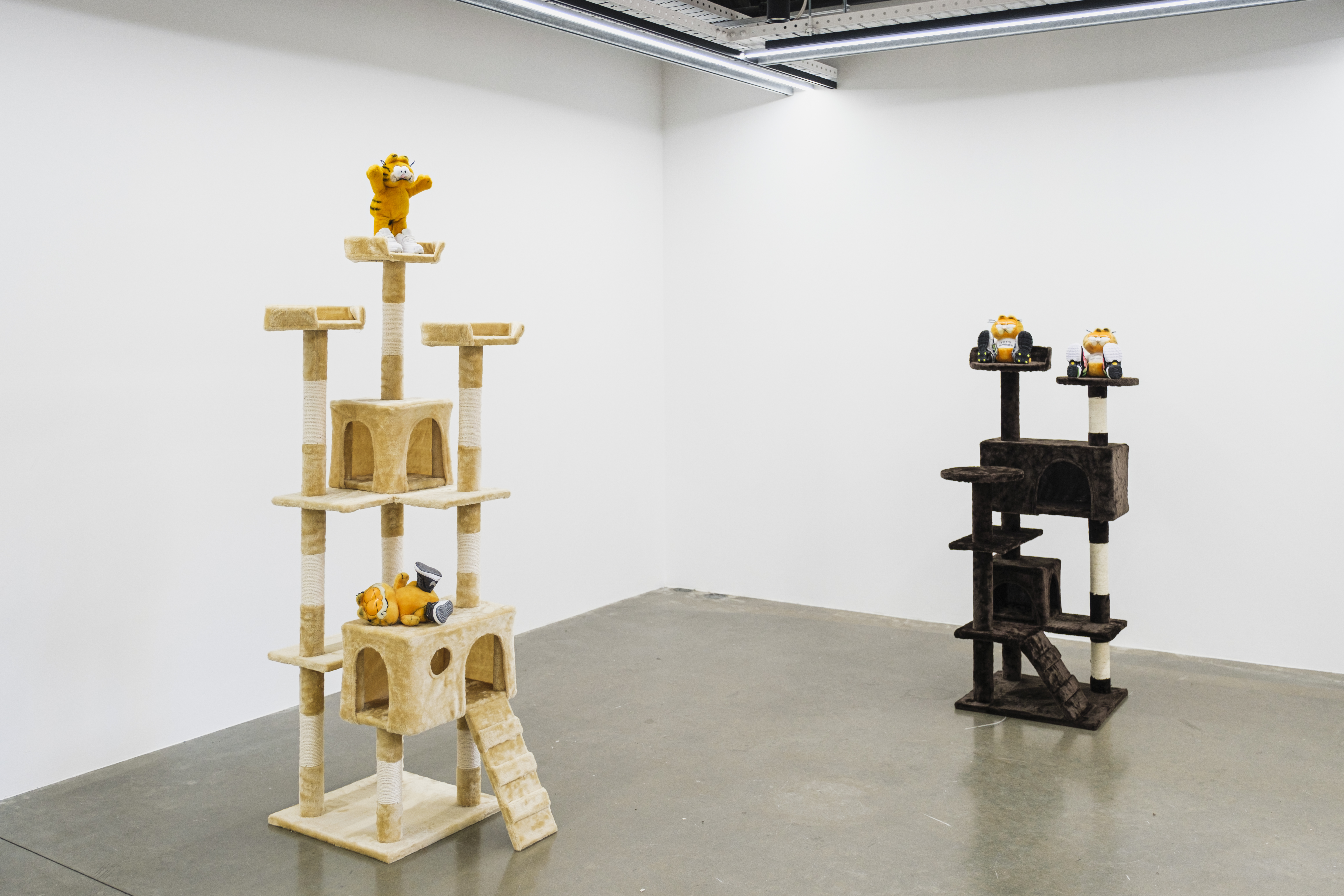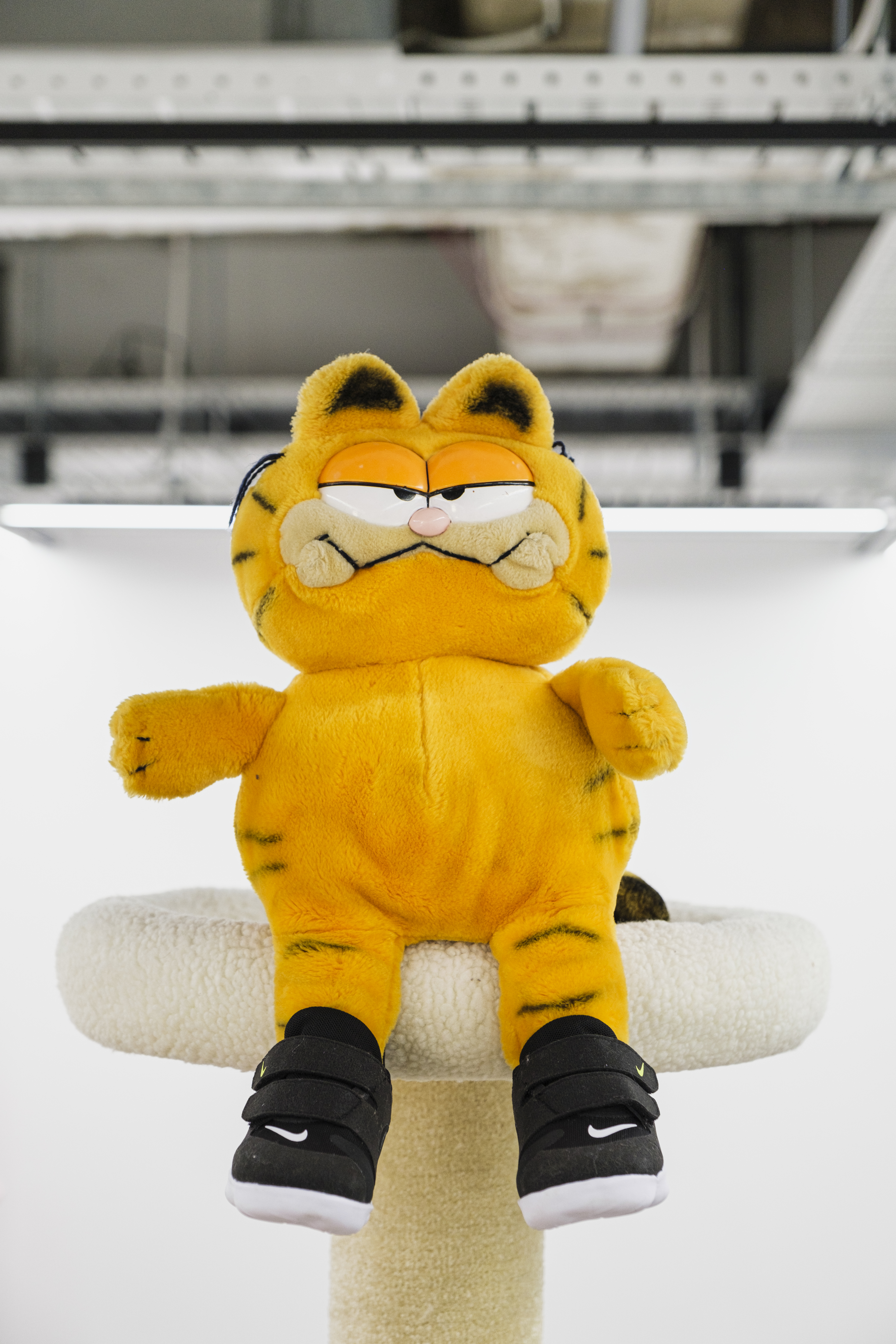 The Last Bastion of Laziness is comprised of a series of assemblages, each including a different vintage Garfield the Cat plush toy, fitted with infant Nike trainers of various design lines—Air Jordan, Air Max, Free Runner among others—that are staged in different poses atop cat scratcher ‘trees’. Playing on the infamous laziness of the cartoon icon as well as the athletic, aspirational pretences of megabrand Nike, the works see Garfield at an impasse; both lazing and competing, winding down and gearing up, seemingly lethargic and ever-ready. These assemblages reveal our ambivalent relationship to work and leisure by exploring the aesthetics of anti-work office culture, and the ‘rise and grind’ ethos of self-optimisation. Through these works Attwood contends that even the once iconically lazy must today negotiate the productivity imperative.